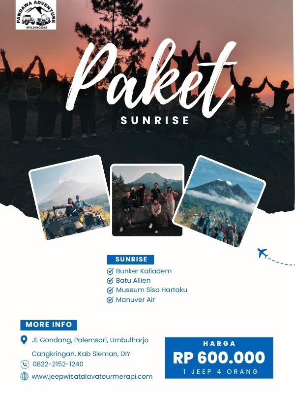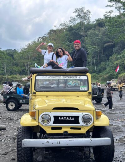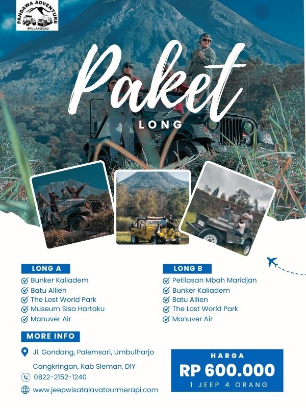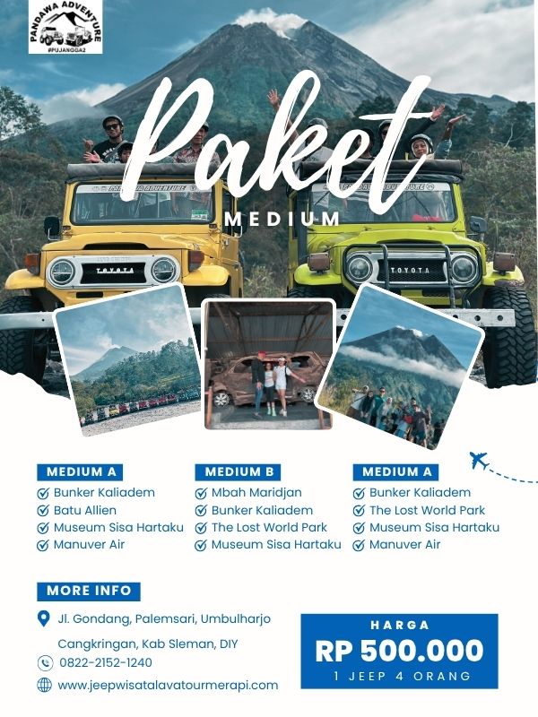 Jeep Wisata Lava Tour Merapi adalah pengalaman wisata petualangan yang menggabungkan adrenalin, edukkasu dan kekaguman terhadap keindahan Gunung Merapi. Kami mengajak anda untuk menelusuri jalur ekstrem bekas aliran lava Erupsi Merapi menggunakan Jeep, menyusuri medan berbatu, sungai kecil, bukit dan tanjakan yang menantang adrenalin.